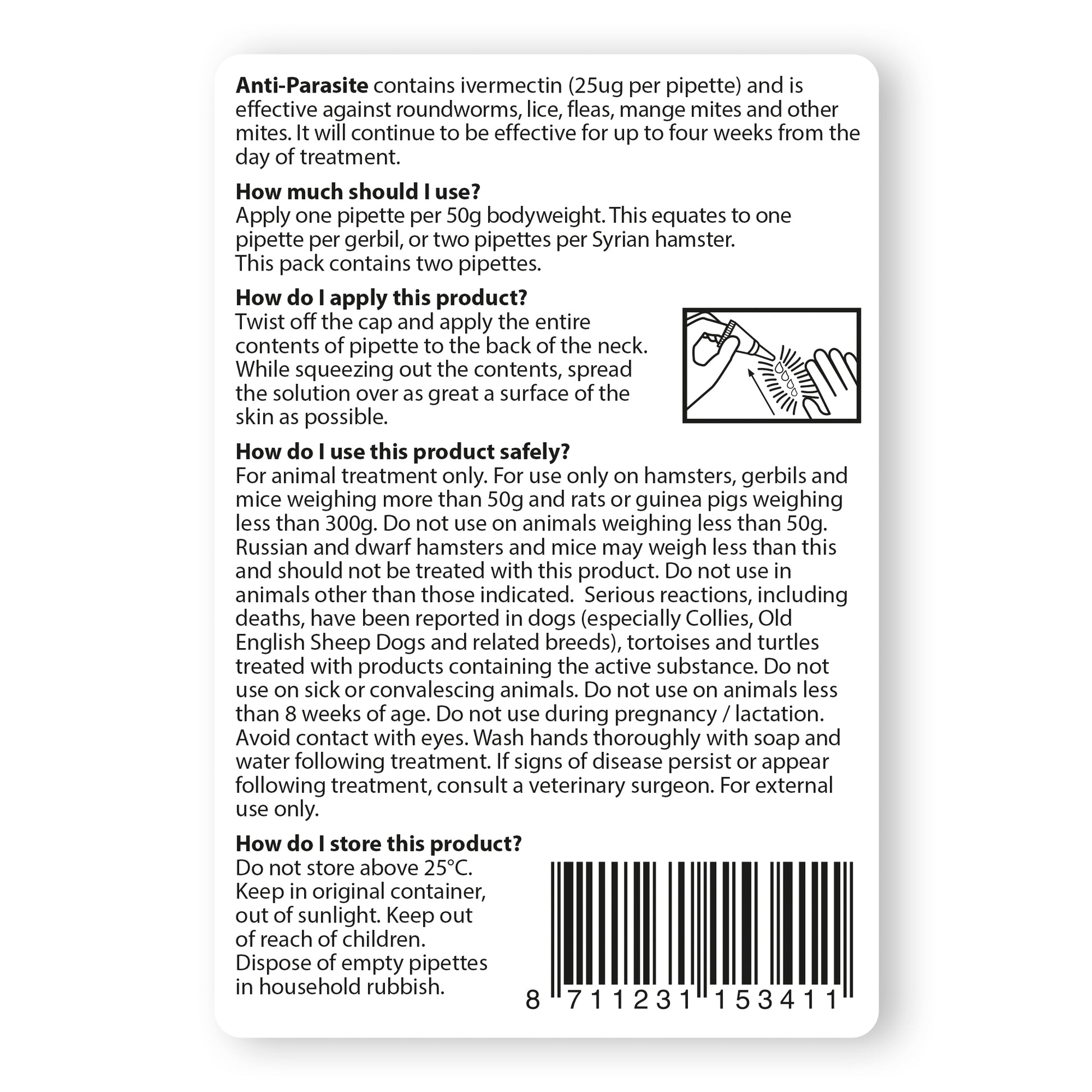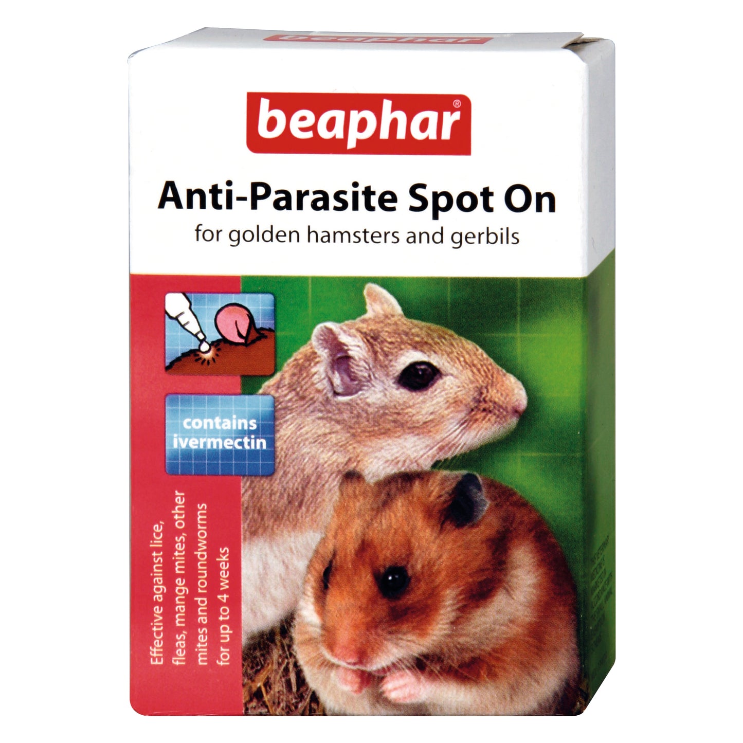 Beaphar's Large Anti-Parasite Spot On is effective against lice, fleas, mange mites, other mites and roundworms for 4 weeks after application on Syrian Hamsters and Gerbils weighing over 50 grams.