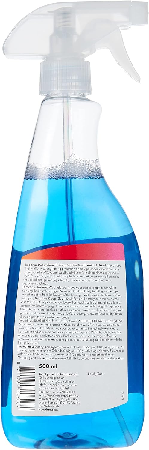 Keep your small pet's home clean, safe, and healthy with Beaphar Deep Clean Disinfectant. This powerful yet gentle disinfectant is specially formulated for the housing and equipment of various small animals, including: