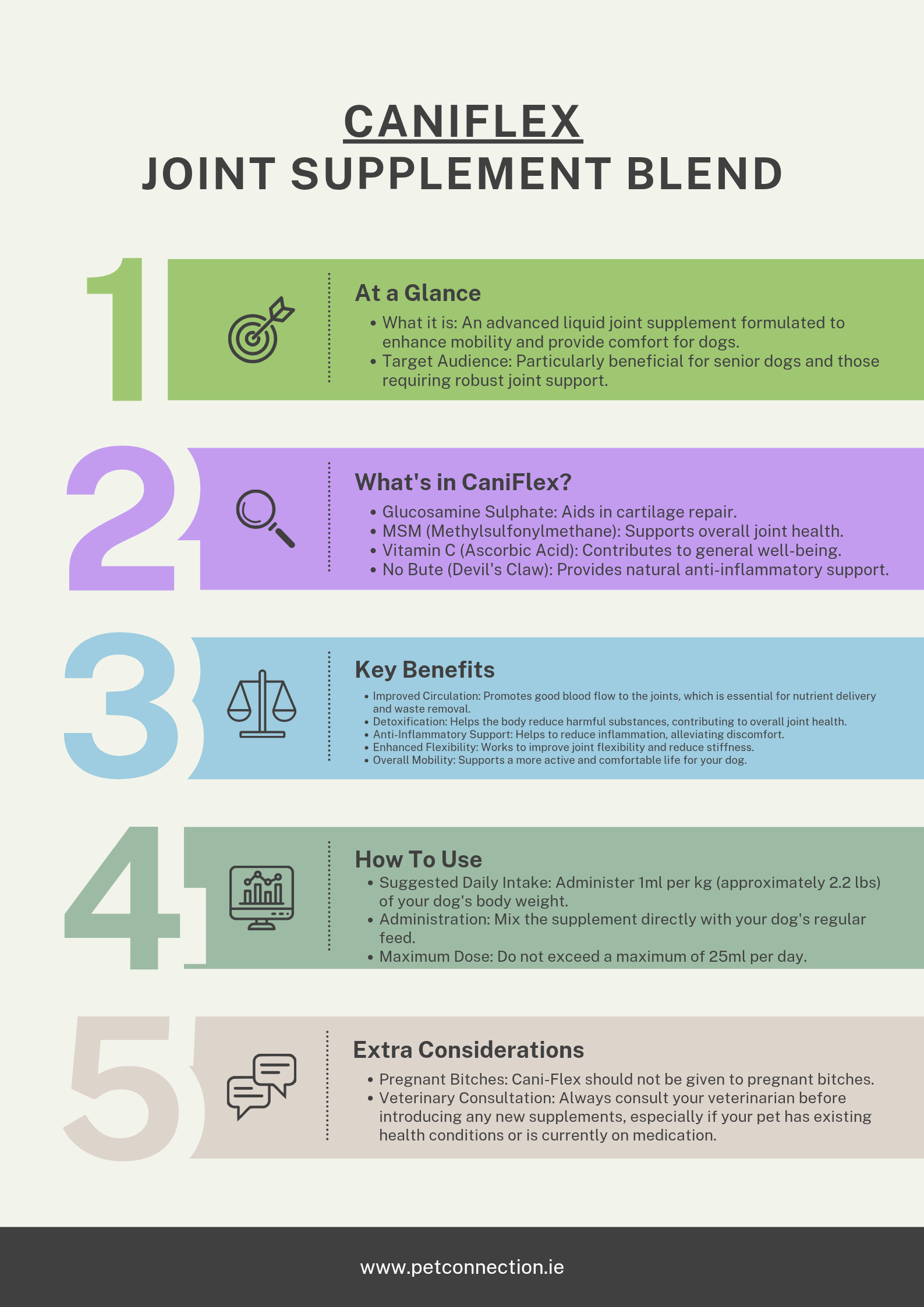 Important Note: Cani-Flex should not be given to pregnant bitches. Always consult your veterinarian before introducing new supplements, especially if your pet has existing health conditions or is on medication.