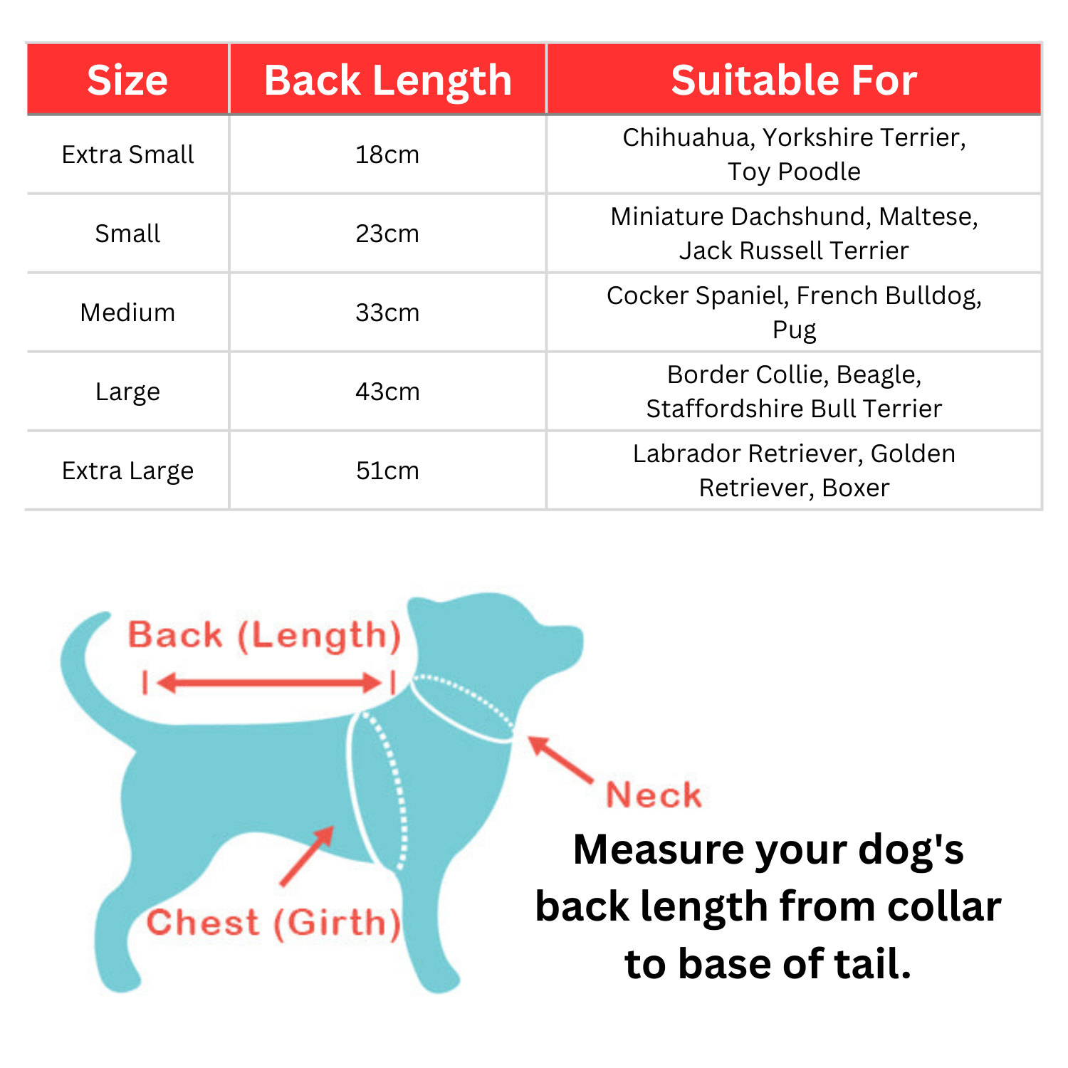 A: Measure from the base of the neck to the base of the tail and compare with the size chart.