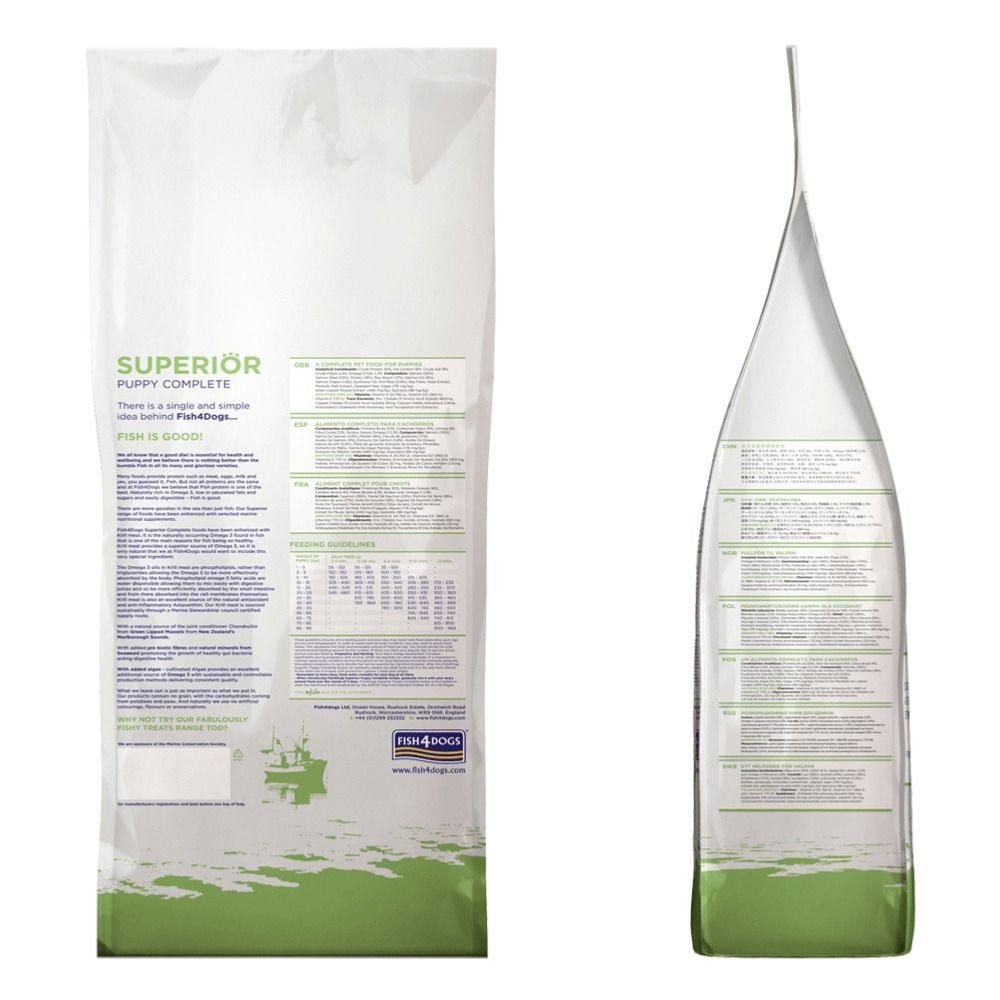 Fish4Dogs Superior Puppy Complete food is further enhanced with added Krill (a superior form of Omega 3, better absorbed by the body), algae (a rich and sustainable form of Omega 3), Green Lipped Mussels (providing a source of joint conditioners Glucosamine and Chondroitin) and pre-biotic fibres from Norwegian seaweed meal for digestive health.