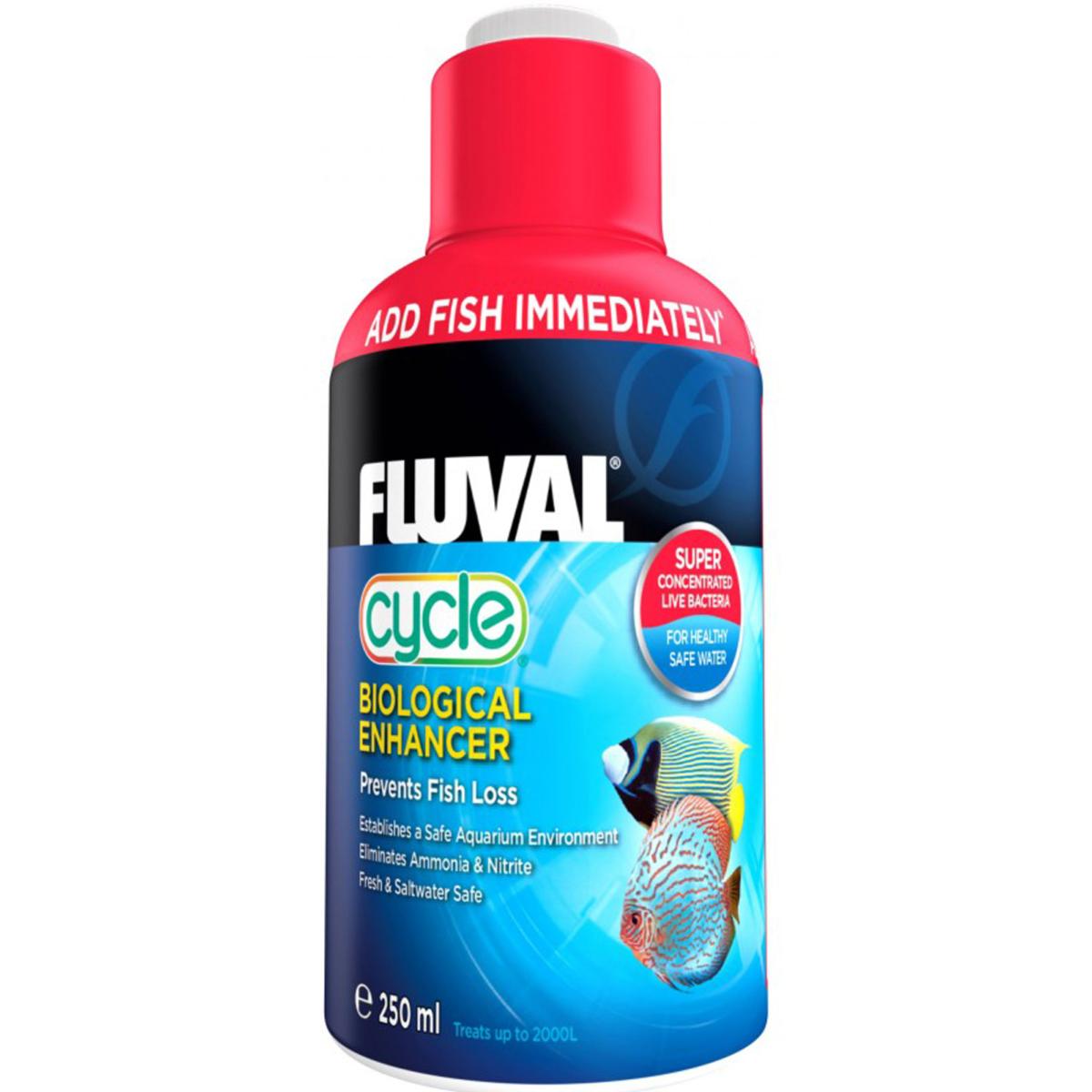 A highly concentrated solution of responsive biological aquarium bacteria, Fluval Cycle immediately inoculates the filtration system with a powerful team of enhancers to eliminate toxic ammonia and nitrites and establish a biologically balanced environment for fish.