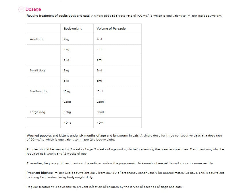- Routine treatment of adult dogs and cats: A single dose at a rate of 100mg/kg bodyweight, which is equivalent to 1ml per 1kg bodyweight.