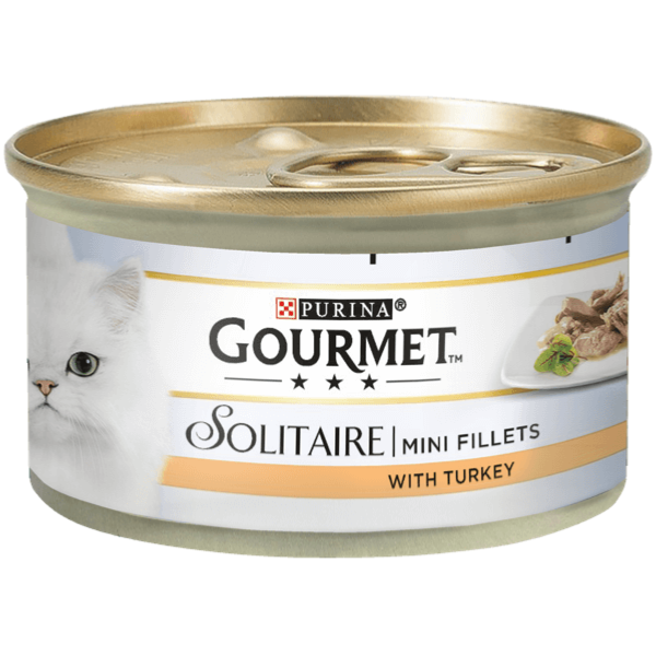Satisfy your feline connoisseur with a delicious meal of Gourmet Solitaire Cat Food, in Turkey Mini Fillets in Sauce.