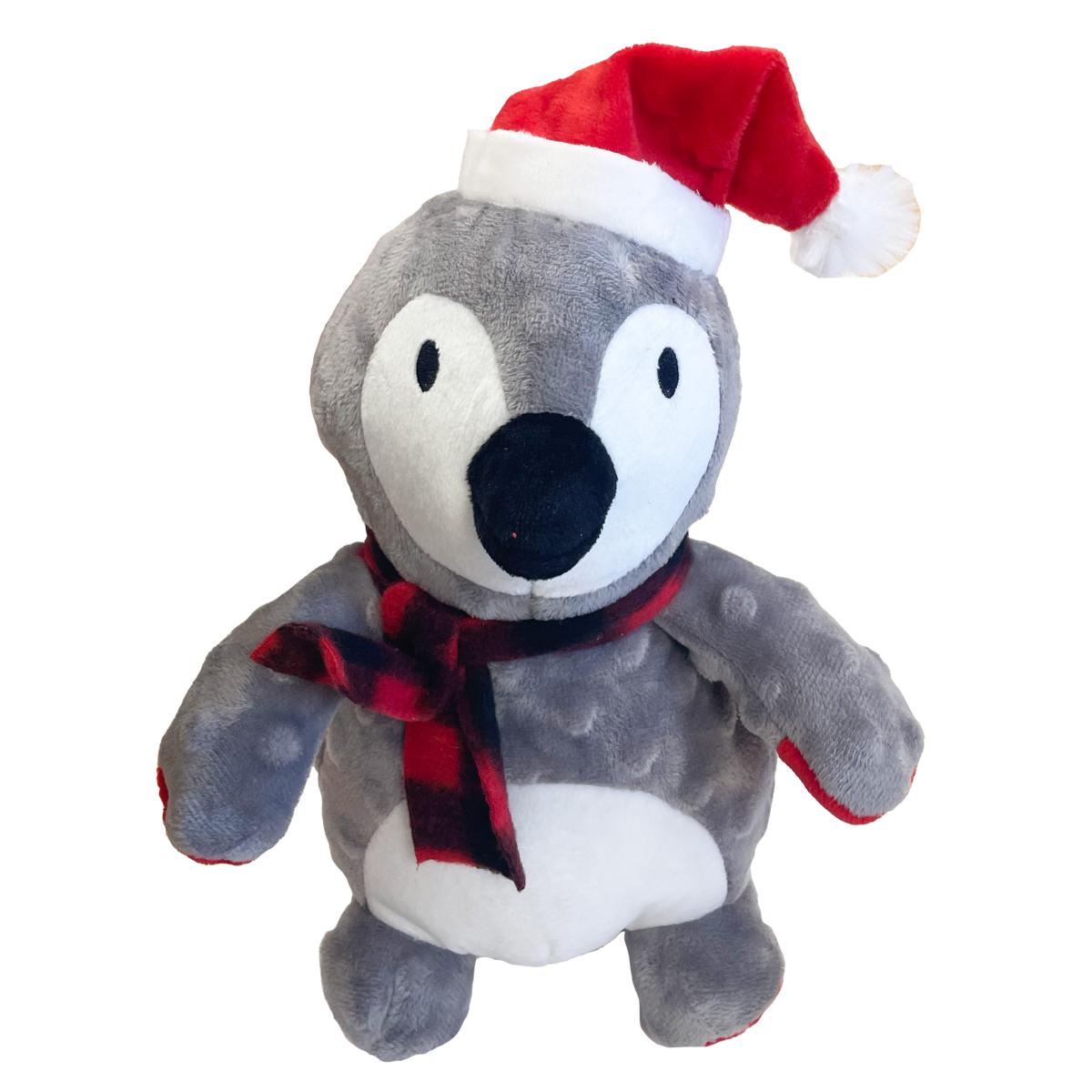A gorgeous grey dotted pattern plush covers the penguin who also wears an adorable Santa hat and patterned tartan scarf.