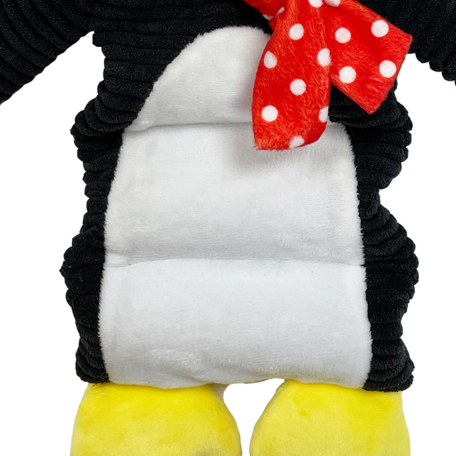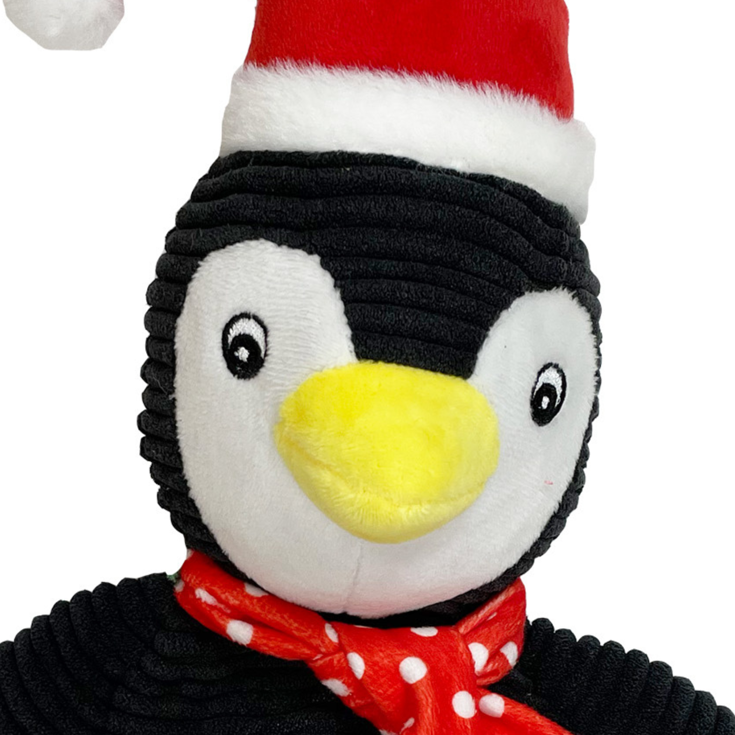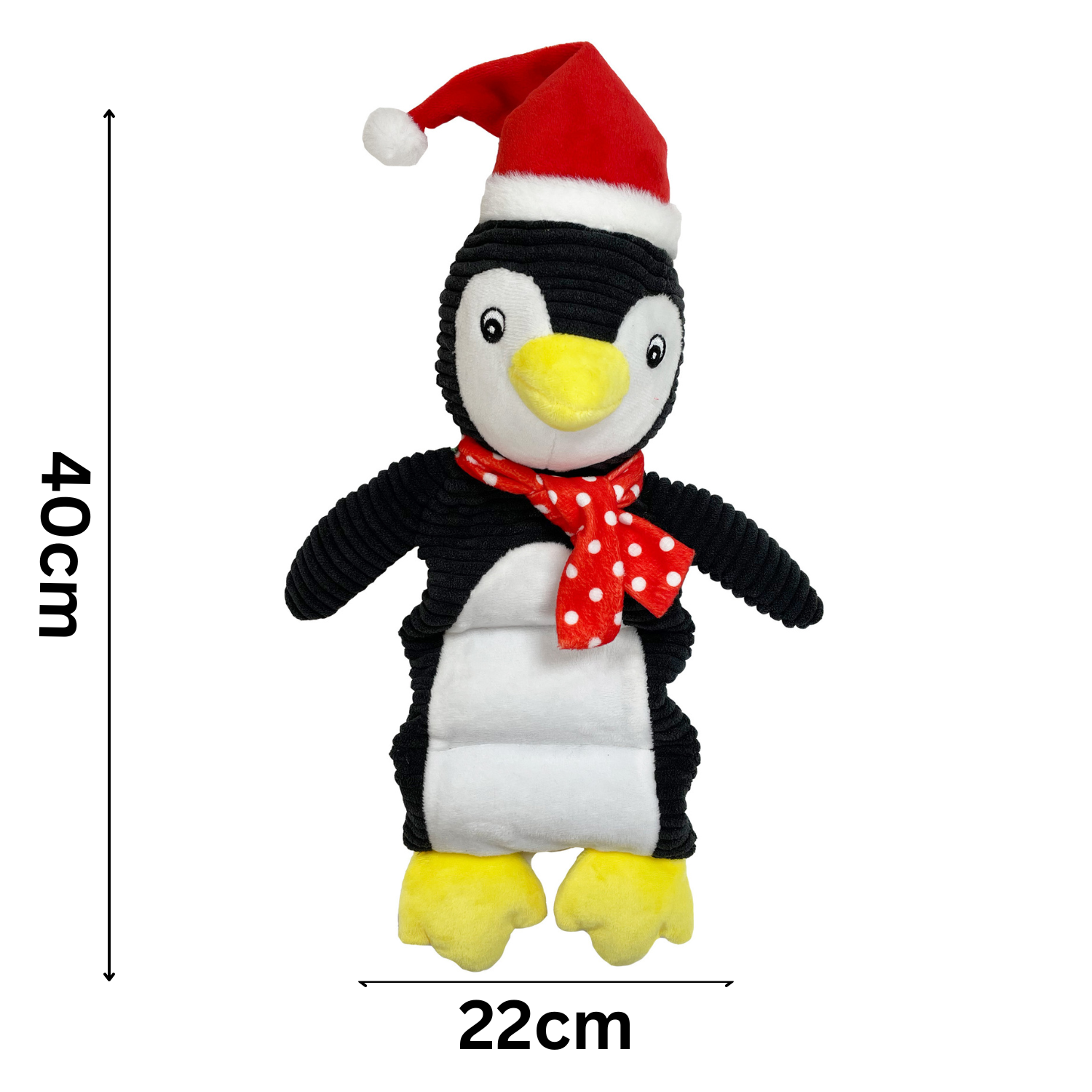 This black and white bird character is made from fabric on the body, which is perfect for cuddles on those cold winter nights after a day full of fun. A super cute Santa hat, yellow beak and feet, and speckled red and white winter scarf complete the adorable toy.