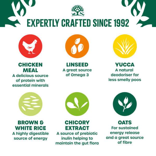 Chicken meal* (21.5%), brown rice* (20.5%), white rice* (20.4%), naked oats* (16%), whole linseed* (4.5%), chicken fat* (4.2%), sugar beet pulp*, chicken gravy (2.9%), pea starch, alfalfa meal*, seaweed*, pea fibre*, fish oil*, potassium chloride, sodium chloride, chicory extract* (0.1%), calcium carbonate, yucca extract* (0.02%).