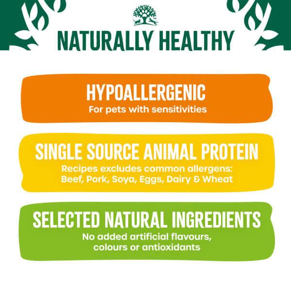 Hypoallergenic dog food for pets with sensitivities. Selected natural ingredients with no added artificial flavours, colours or antioxidants.