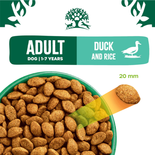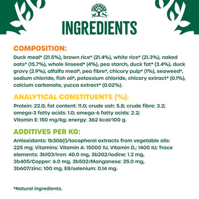 Composition: Duck meal (21.5%), brown rice (21.4%), white rice (21.3%), naked oats, whole linseed, pea starch, duck fat (3.4%), duck gravy (2.9%), alfalfa meal, pea fibre, chicory pulp, seaweed, sodium chloride, fish oil, potassium chloride, chicory extract (0.1%), calcium carbonate, yucca extract (0.02%), green tea extract (0.003%), pomegranate extract (0.001%), rosemary extract (0.001%). Additives per kg: Vitamin A: 15000 Iu, Vitamin D₃: 1400 Iu; Trace Elements: 3B103/Iron: 40.0 Mg, 3B202/Iodine: 1.2 Mg, 3B405/Copper: 6.0 Mg, 3B502/Manganese: 25.0 Mg, 3B607/Zinc: 100 Mg, E8/Selenium: 0.14 Mg.