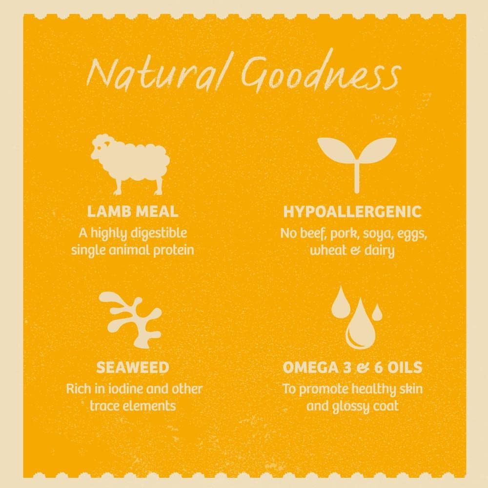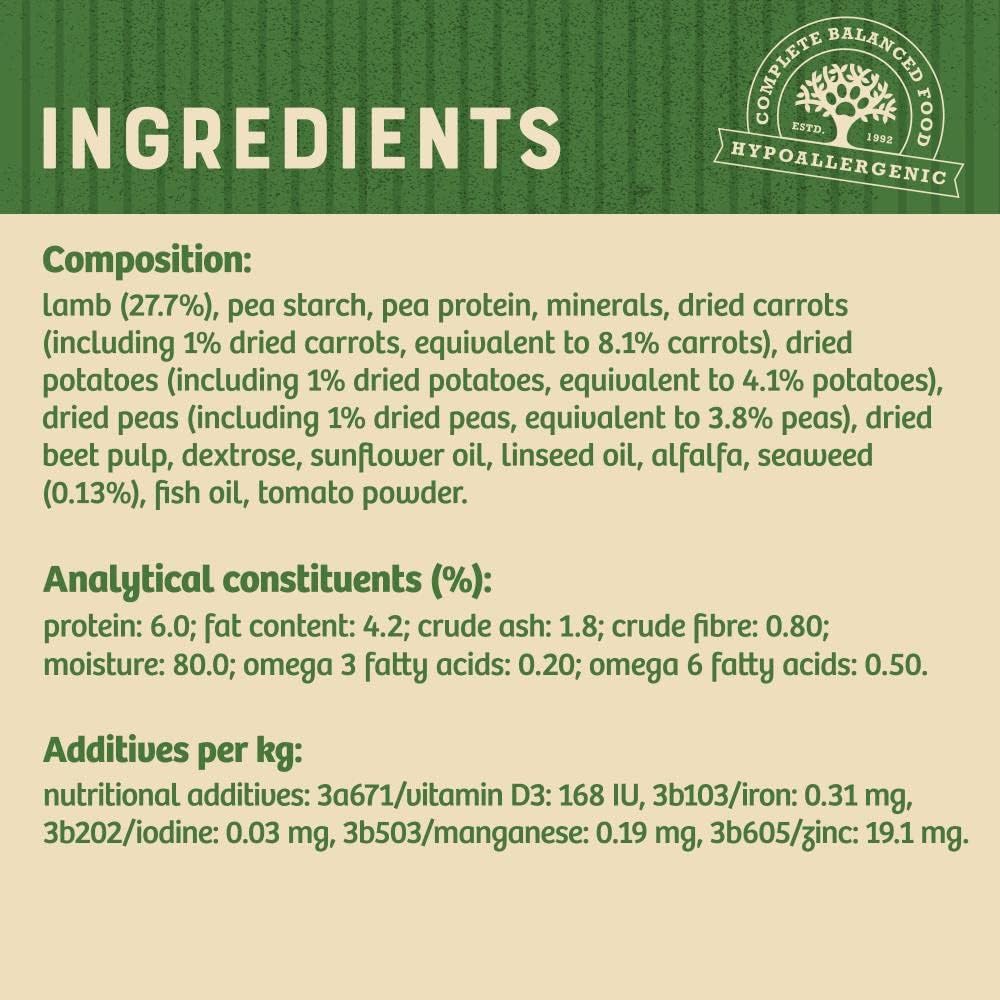 Composition: lamb meat (28.5%), rice (10.5%), peas (4%), carrots (4%), sugar beet pulp, sunflower oil, calcium carbonate, linseed oil, sodium chloride, alfalfa meal, seaweed, tomato powder.