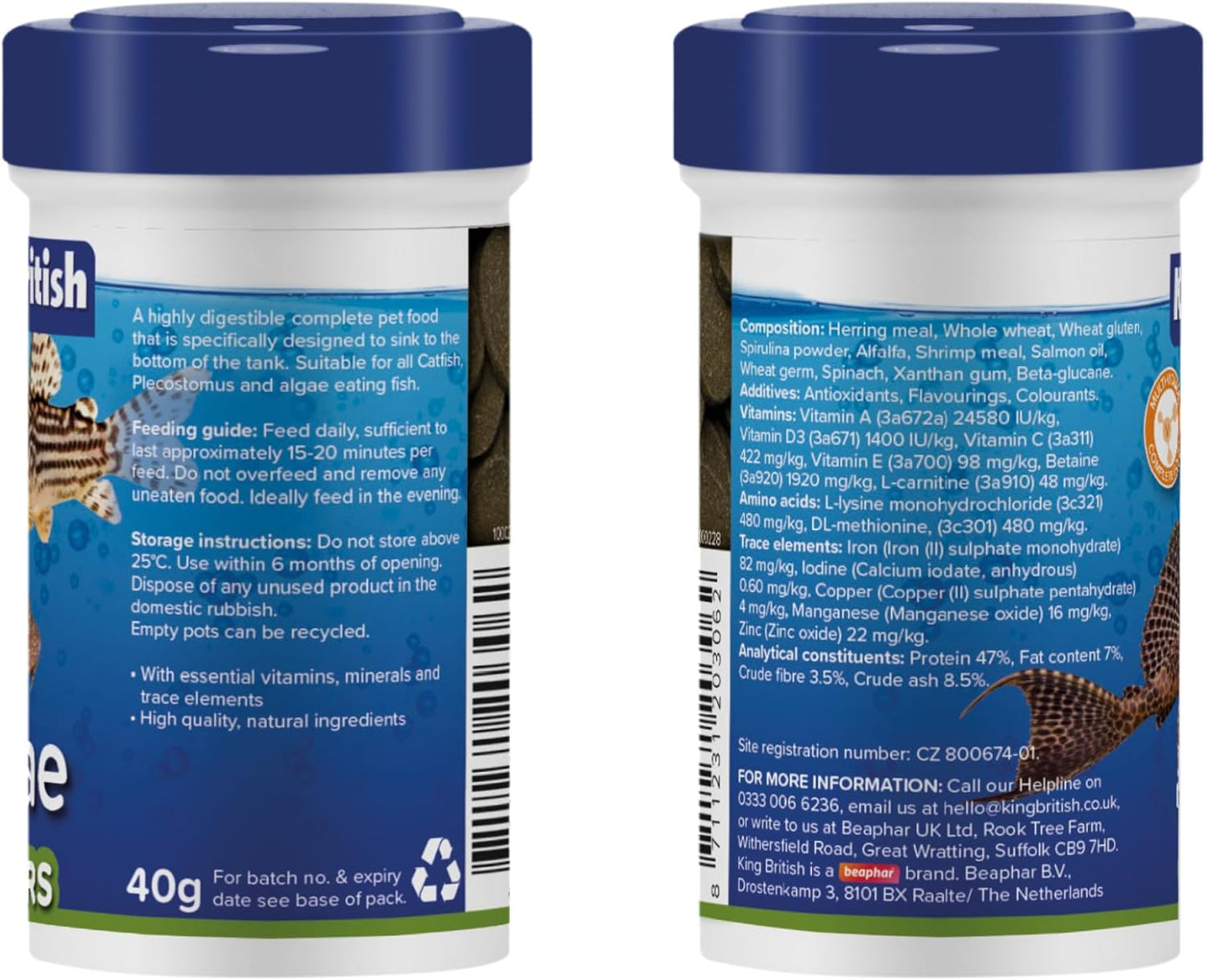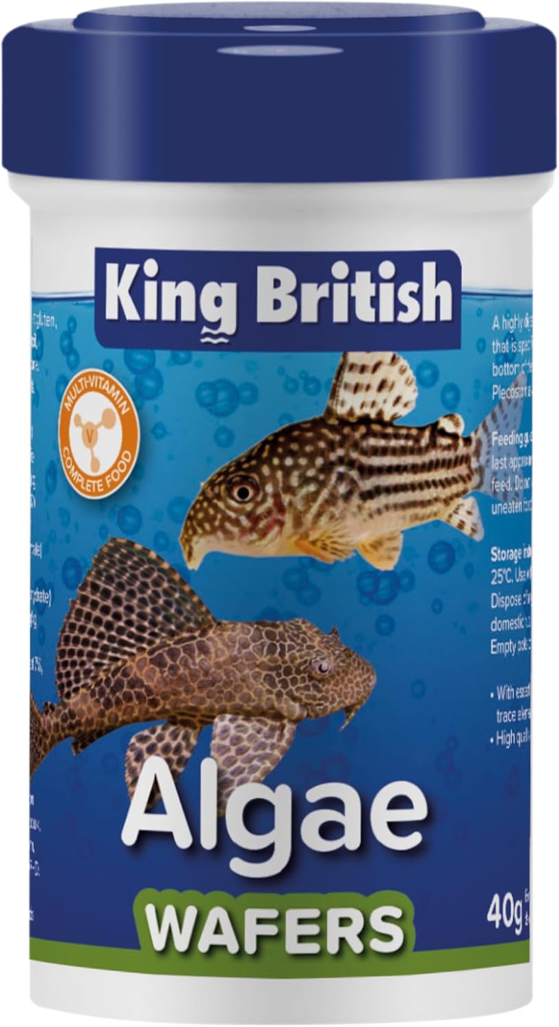 Provide essential nutrition for your aquatic companions with King British Algae Wafers. This complete and balanced sinking food is specifically formulated for the unique dietary needs of algae-eating fish like Plecos and Otos, as well as various bottom-feeding species such as Corydoras and Loaches. In a convenient 40g pack, these highly palatable wafers deliver a rich blend of plant-based ingredients and vital nutrients to support health, vitality, and vibrant natural colours in your aquarium fish across Ireland & UK.