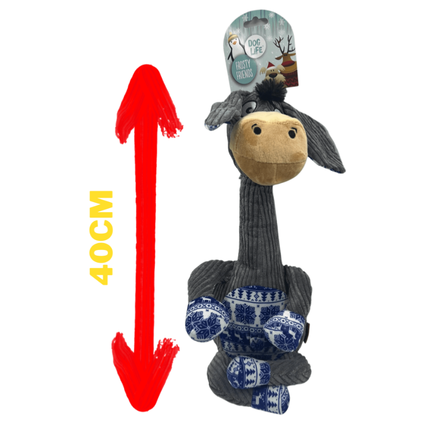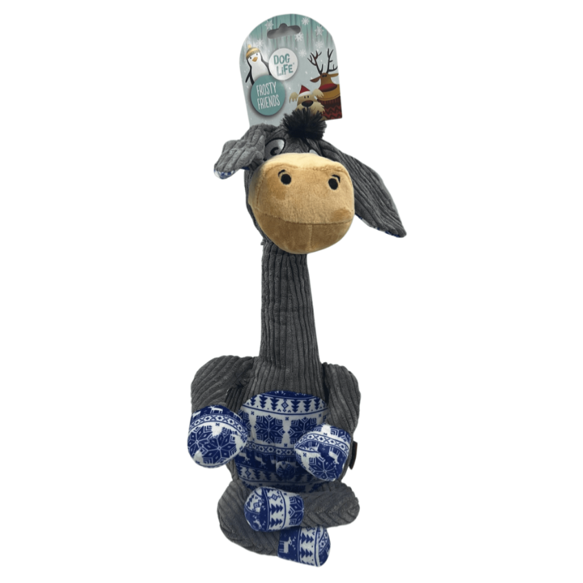 Adorned with beautiful blue and white winter themed plush patterning on his feet and belly, the corduroy style fabric covering the rest of his long grey body and floppy ears present a multi-textured experience for dogs lucky enough to get to play with this cracking donkey.