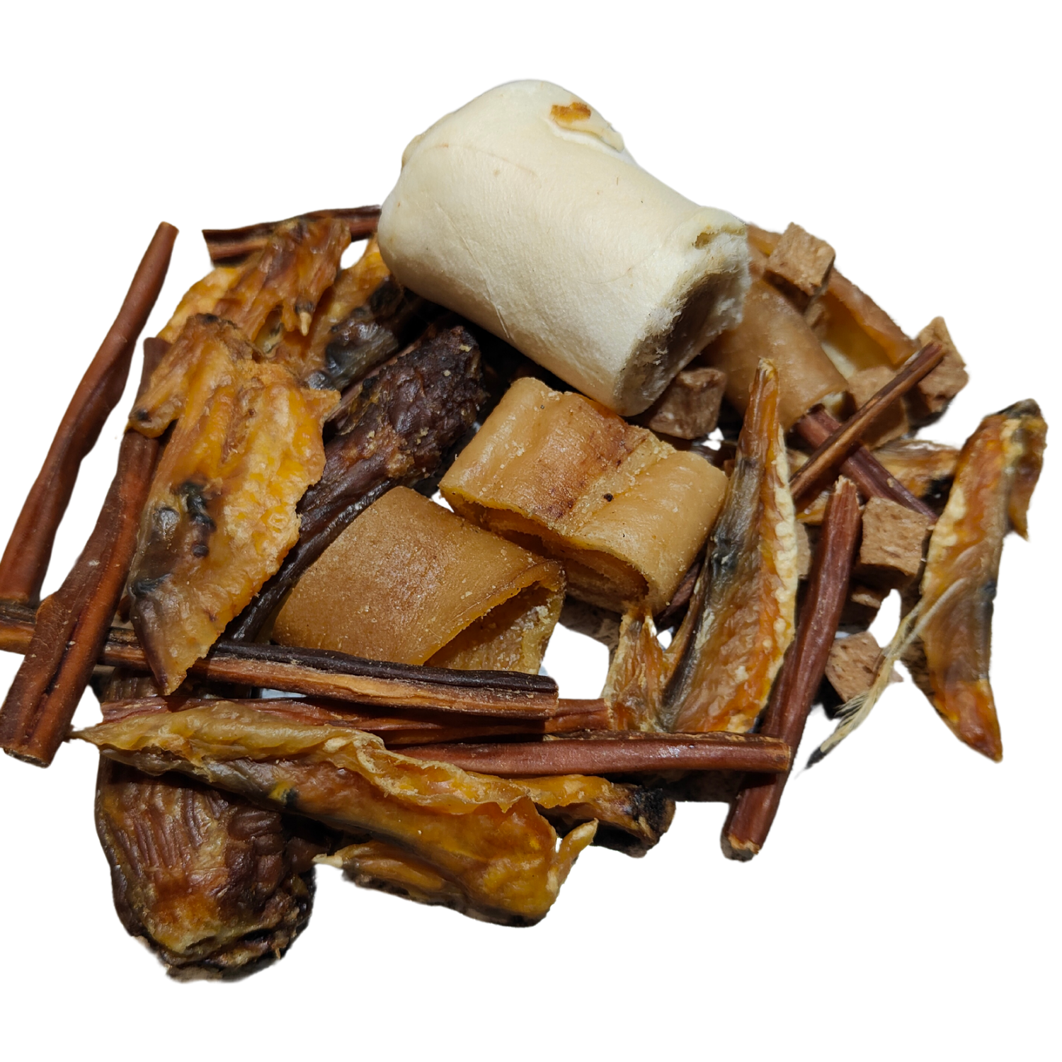 - Variety of Treats: A mix of buffalo chewlets, chicken wings, pork skin crisp rolls, beef tail chunks, chicken necks and crunchy natural chicken herb bites.