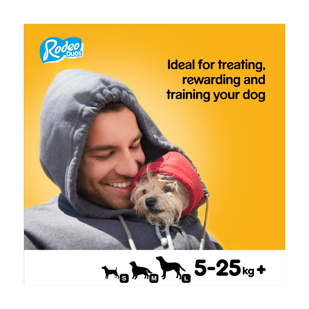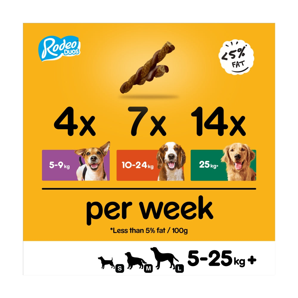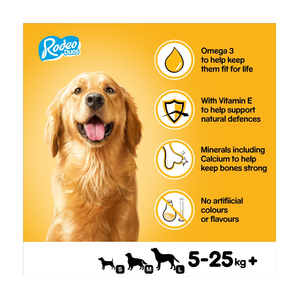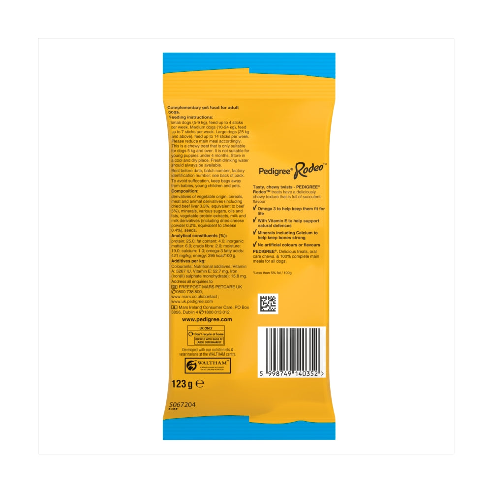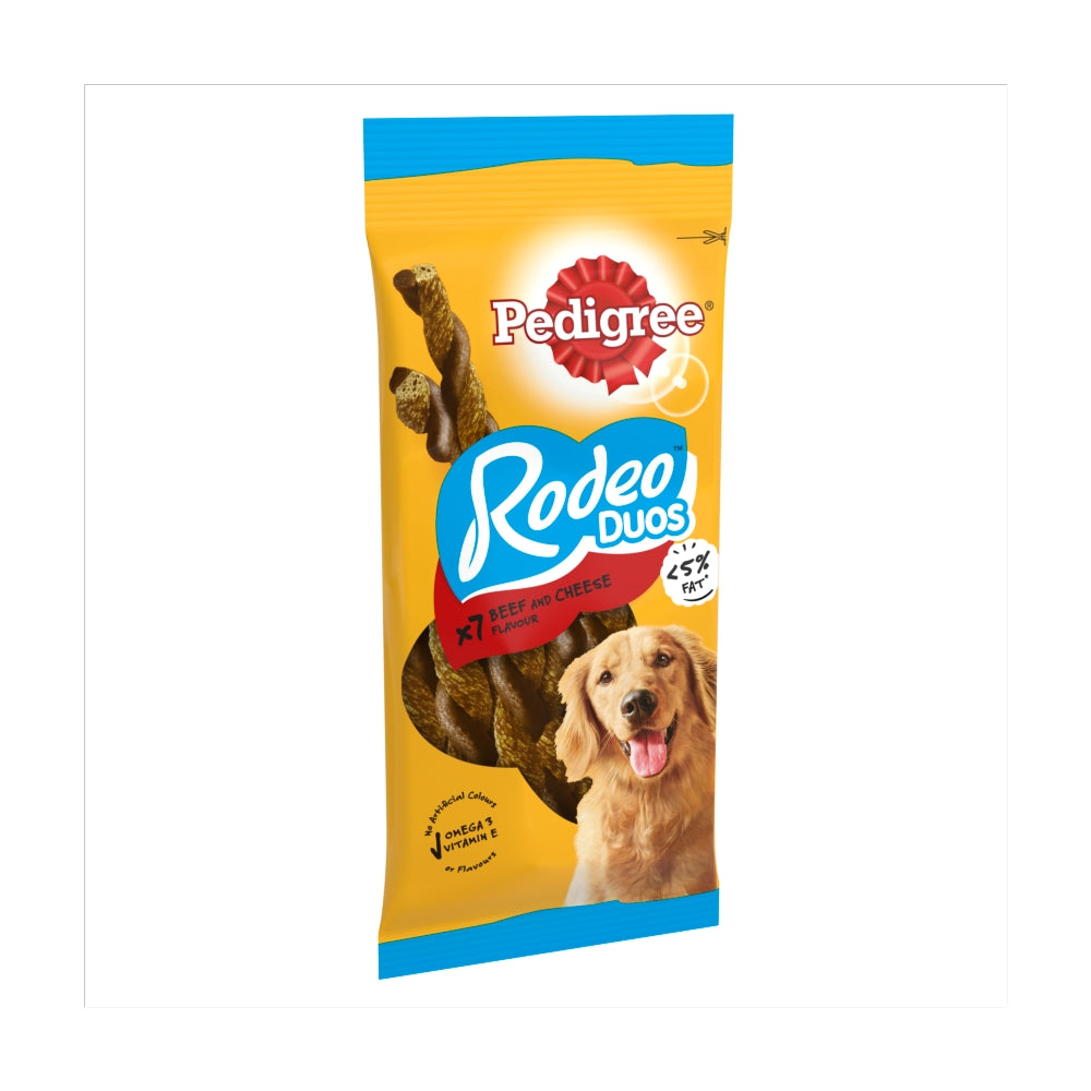 Pedigree Rodeo Duos Beef & Cheese treats are the perfect combination of tasty and nutritious. These deliciously chewy twists are filled with succulent beef and cheese flavours, making them a favourite for training or as a special reward. With Omega 3, Vitamin E, and Calcium, these 7 stick twists are not only delicious but also provide essential nutrients for your dog. Plus, they contain no artificial colours or flavours.