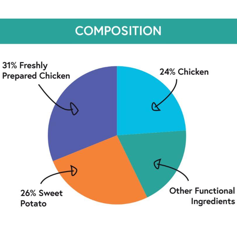 Chicken 55% (including Freshly Prepared Chicken 31%, Dried Chicken 21% & Chicken Stock 3%), Sweet Potato (26%), Peas (6%), Potato, Beet Pulp, Linseed, Omega 3 Supplement, Minerals, Vitamins, Vegetable Stock, Marjoram, Basil, Oregano, Sage, Thyme, Parsley, FOS (96 mg/kg), MOS (24 mg/kg).