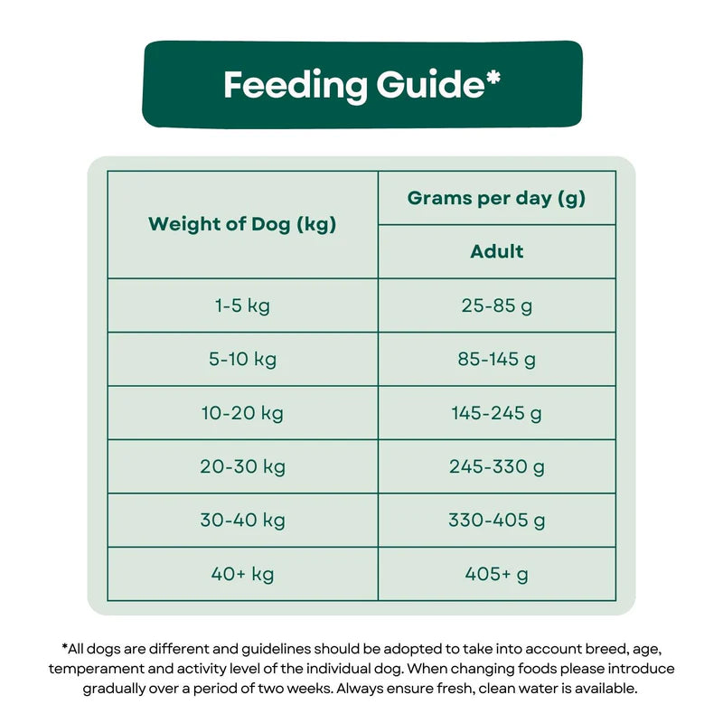 These amounts are guidelines only. Always adjust based on your dog’s condition and activity level. Fresh drinking water should be available at all times.