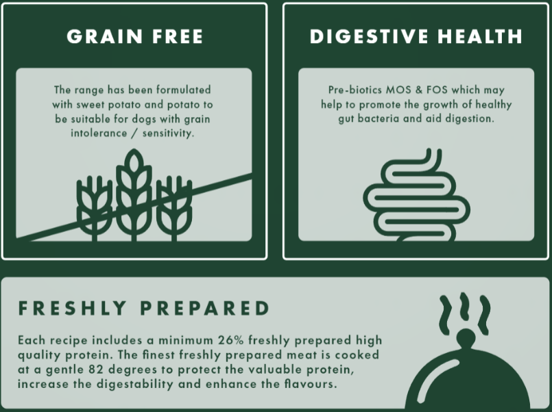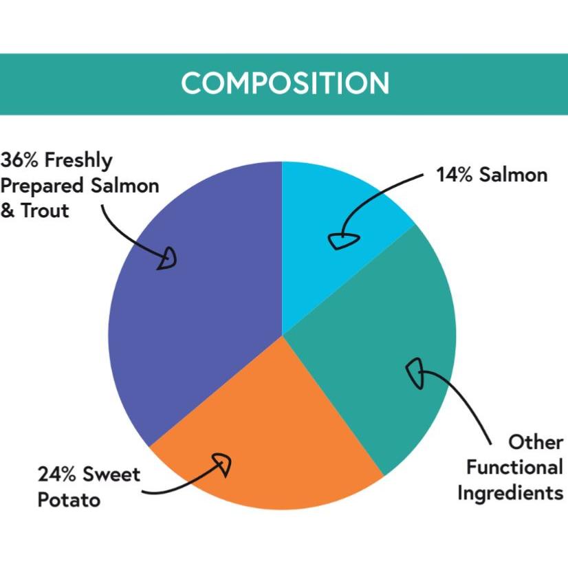 Composition: Salmon (26%), Trout (24%), Sweet Potato (20%), Peas, Potato, Beet Pulp, Omega 3 Supplement, Vitamins & Minerals, Asparagus, Prebiotics: Fructooligosaccharides (FOS), Mannanoligosaccharides (MOS)
