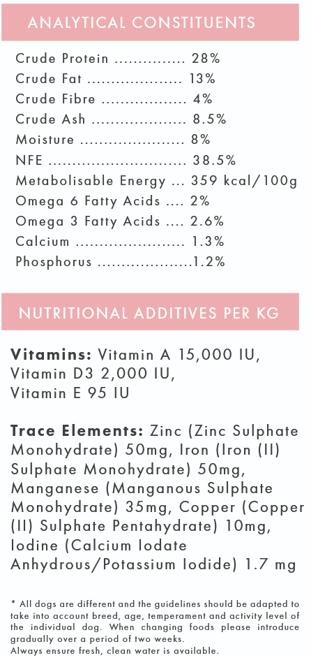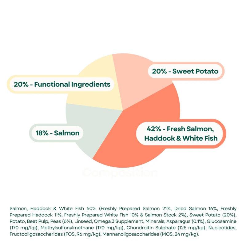 Composition: Salmon, Haddock & Blue Whiting 60% (Freshly Prepared Salmon21%, Dried Salmon 16%, Freshly Prepared Blue Whiting 11%, Freshly Prepared Haddock 10% & Salmon Stock 2%), Sweet Potato (20%), Potato, Beet Pulp, Peas (6%), Linseed, Omega 3 Supplement, Minerals, Vegetable Stock, Asparagus (0.2%), Glucosamine (170 mg/kg), Methylsulfonylmethane (170 mg/kg), Chondroitin Sulphate (125 mg/kg), Nucleotides, Fructooligosaccharides (FOS, 96 mg/kg), Mannanoligosaccharides (MOS, 24 mg/kg)