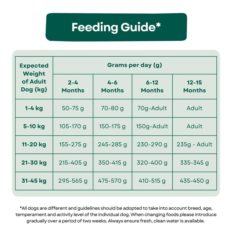- Large Breed Puppies (26kg+ adult weight): 280g–450g per day