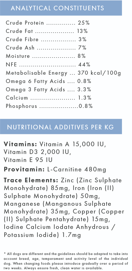 Analytical Constituents: Crude Protein 25%, Crude Fat 13%, Crude Fibre 2%, Crude Ash 7%, Moisture 8%, NFE 45%, Omega 6 0.8%, Omega 3 3.3%, Calcium 1.3%, Phosphorus 0.8%
