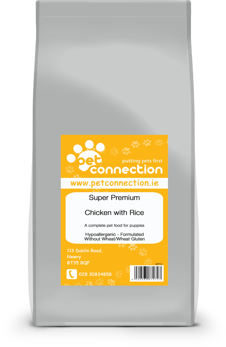 Nourish your growing puppy with a complete and delicious diet designed for their specific growth needs with Pet Connection's Super Premium Puppy Food - Chicken & Rice. Our specially selected hypoallergenic blend is crafted from the finest freshly prepared ingredients, providing a high-quality protein source in a formula which is free from many of the common dietary allergens. The crunchy kibble is optimally sized and shaped to be enjoyed by puppies of all sizes, ensuring they receive the precise nutrition needed for robust development and a healthy start in life across Ireland & UK.