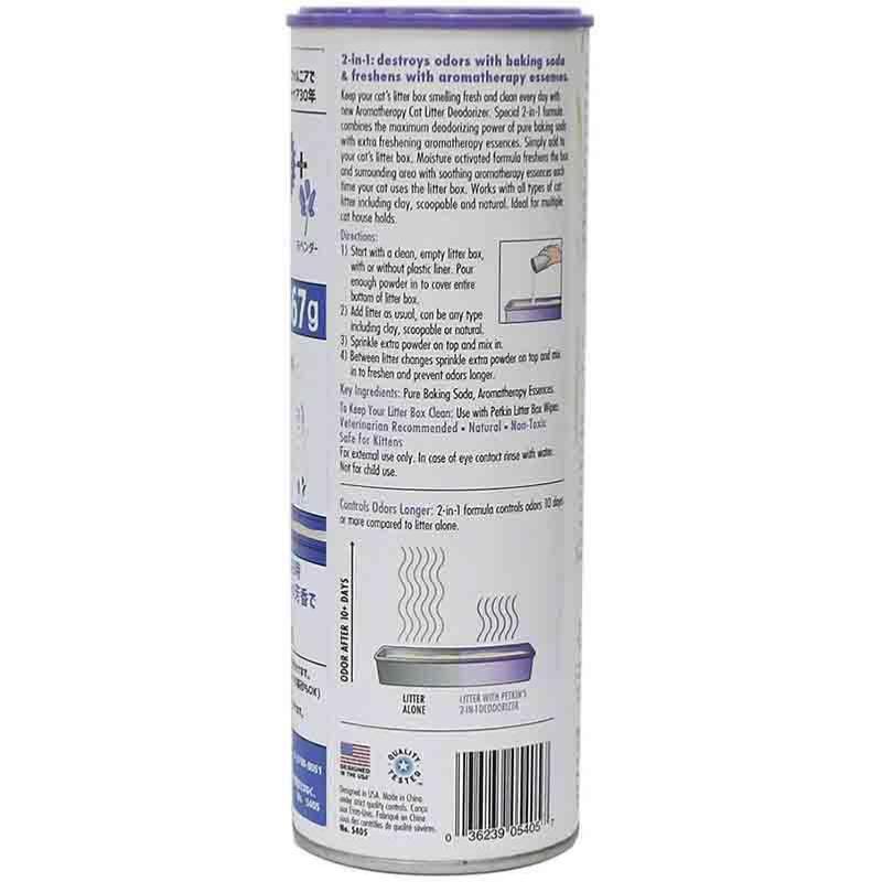 The special 2-in-1 formula combines the maximum deodorizing power of pure baking soda with extra freshening aromatherapy essences, all you need to do is add it to your cat’s litter box. The moisture activated formula freshens the box and surrounding area with soothing aromatherapy essences each time your cat uses the litter box.