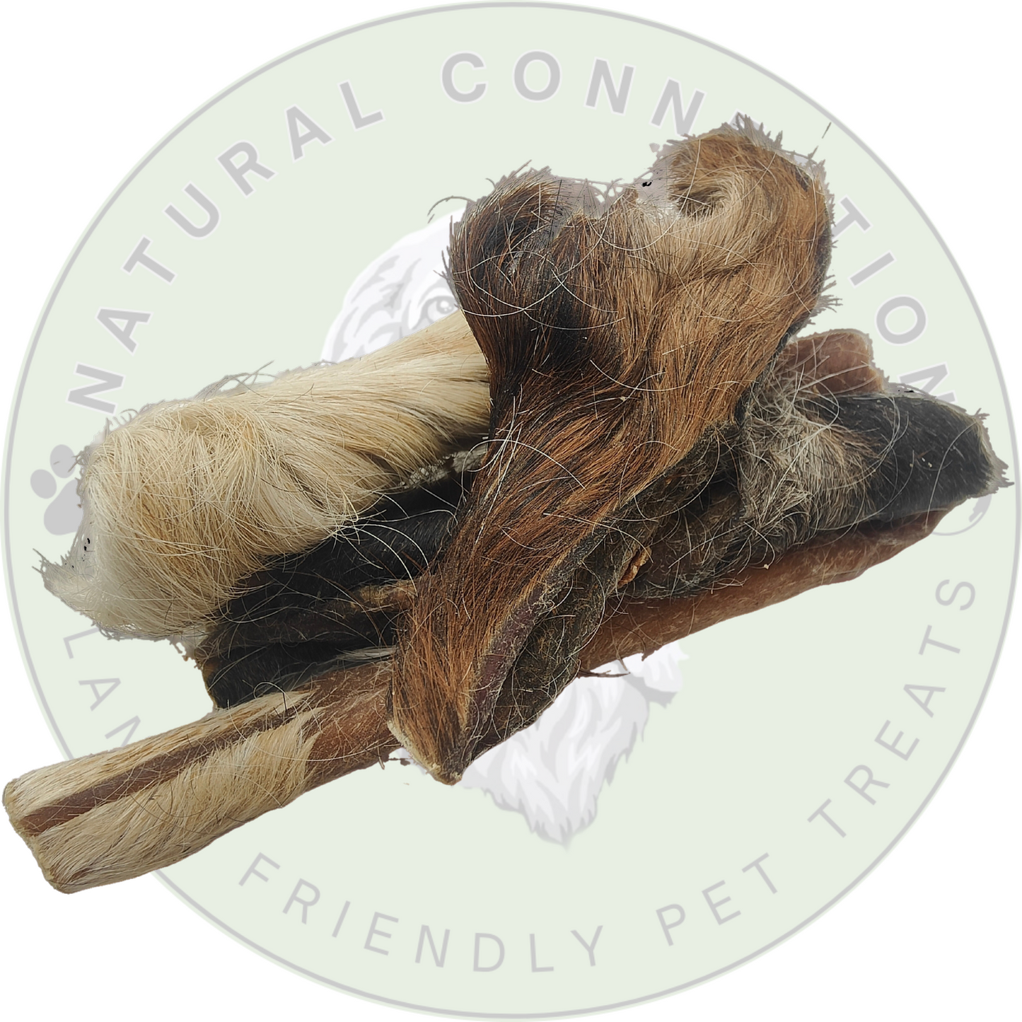 A truly species appropriate snack for those who enjoy raw and BARF (biologically appropriate raw food) diets, as wolves in the wild will hunt cows in the valleys and eat the entire body - including bones and fur. It is believed that fur and hair can act as natural dewormers for dogs, as the hair and fibre pass through the intestines and clear internal parasites.