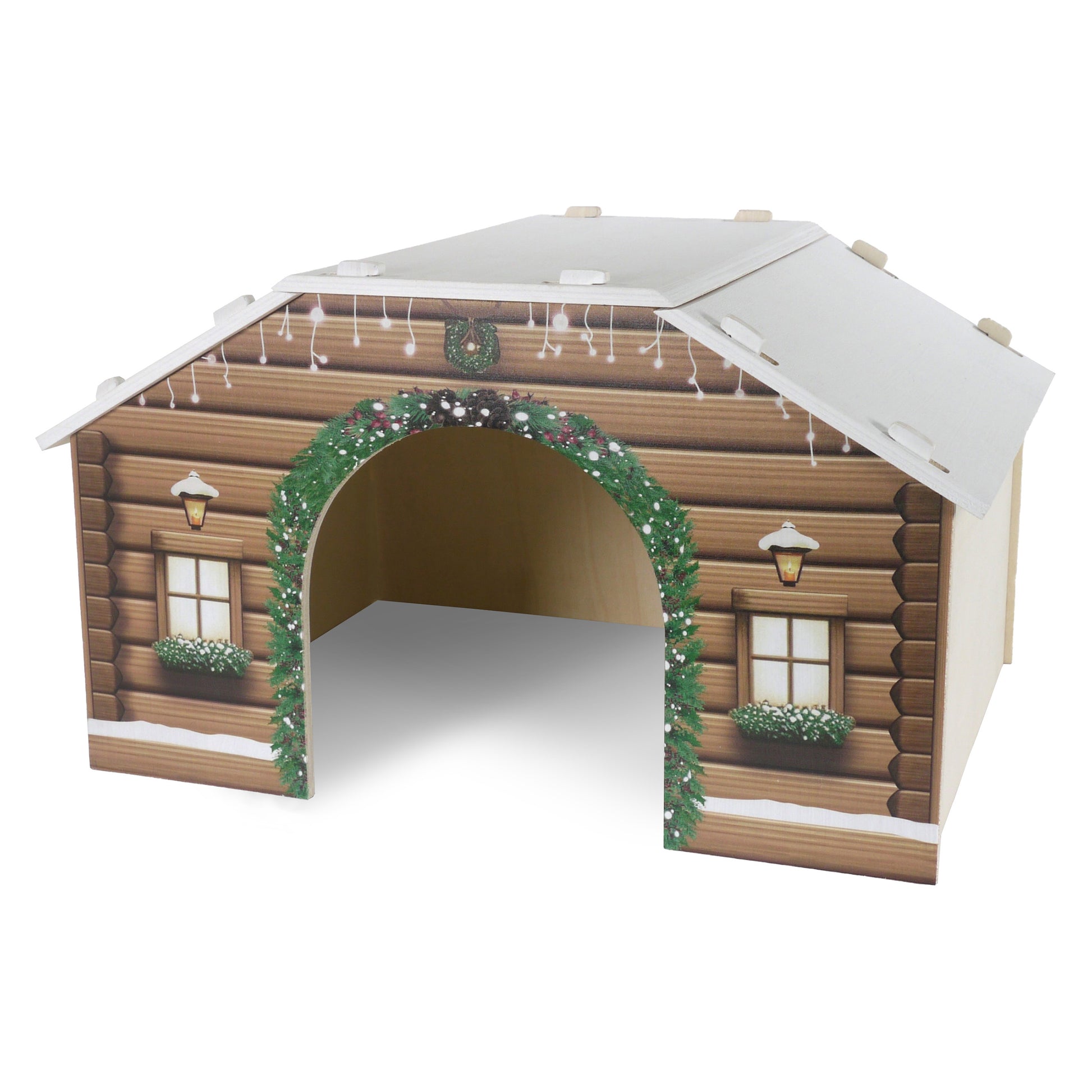 Provide your guinea pigs and small rabbits with a secure and comfortable retreat with the Cupid & Comet Winter Cabin Hideaway! This charming cabin is perfect for sleeping, hiding, or just relaxing, giving your pets a sense of safety and comfort. Made from 7 sturdy plywood panels, it easily slots together for quick assembly.