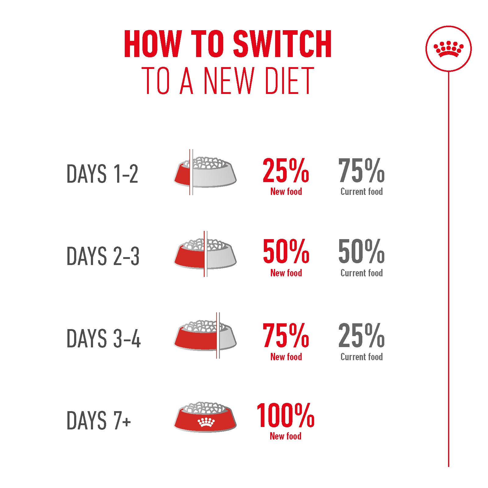 - Gradual transition: Mix new food in gradually over 7–10 days to avoid digestive upset.