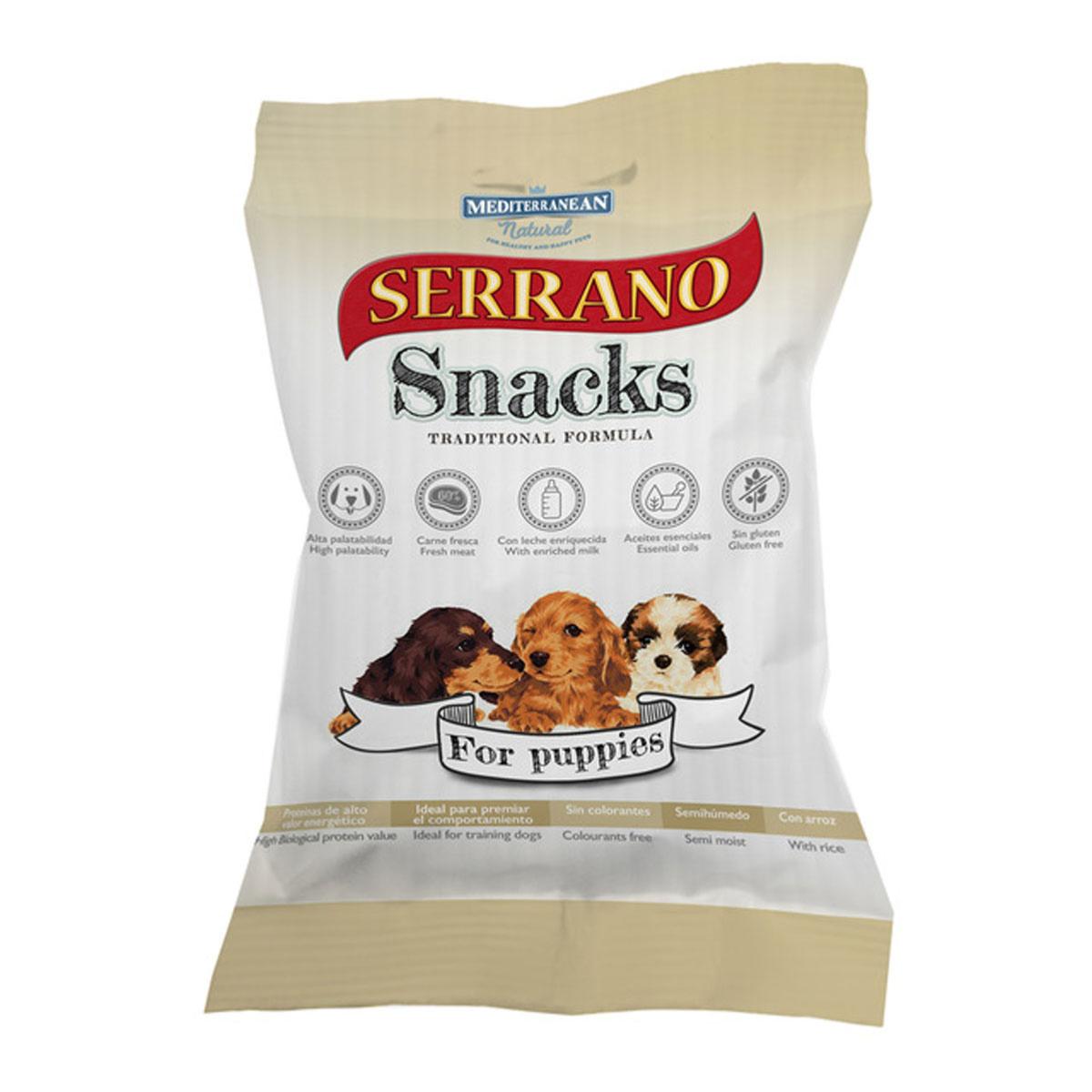 Mediterranean Natural Serrano Snacks are a delicate yet traditional formula of 60% fresh meat with rice, perfect for sensitive stomachs of growing puppies.