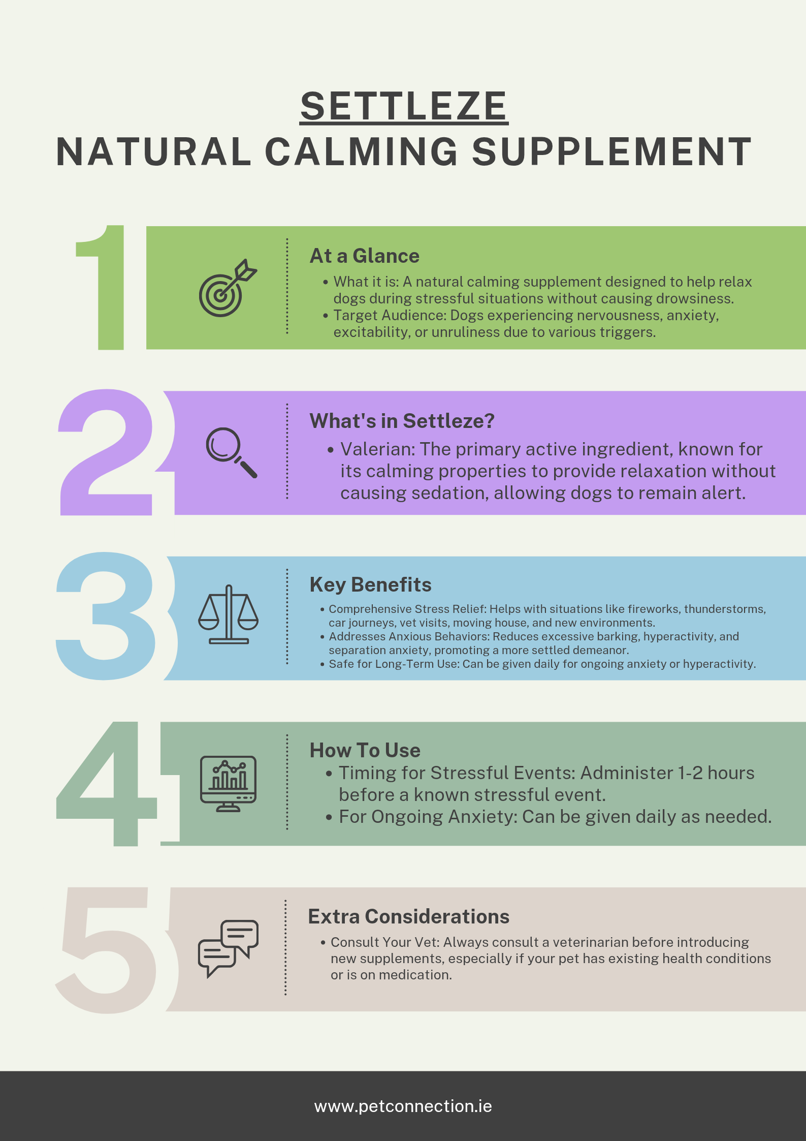 - Natural Calming Action: Settleze calms your pet without resorting to sedation, ensuring they remain alert and responsive, simply feeling more relaxed and less overwhelmed by their surroundings.