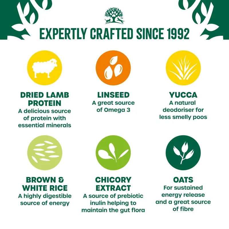 Dried lamb protein* (19%), barley*, naked oats*, brown rice* (13%), white rice* (13%), poultry fat*, whole linseed* (3.9%), pea protein, lamb gravy, sugar beet pulp*, alfalfa meal*, minerals, seaweed* (0.5%), fish oil, chicory extract* (0.1%), yucca extract* (0.02%).