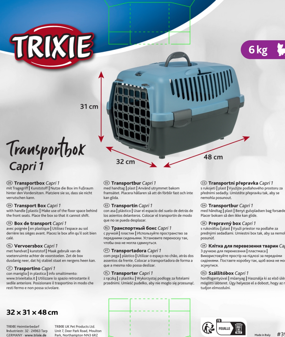 Strategically placed ventilation slits ensure optimal air flow throughout the carrier, keeping your pet cool and calm. Lightweight at just 1.2kg and measuring 48cm long x 31cm wide x 32cm high, it's easy to carry while accommodating a maximum load of 6kg. Choose the Trixie Capri 1 for reliable pet travel solutions and ultimate pet safety in cars.