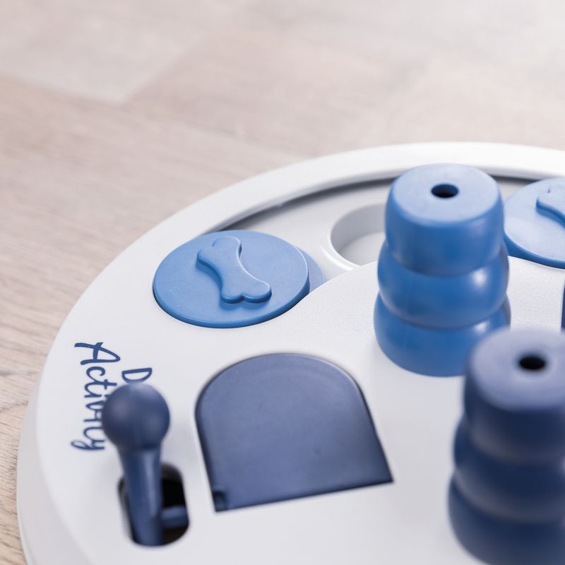 The Trixie Dog Activity Flip Board uses sliding covers, levers and 2 cones to cover indentations that can be filled with treats, meaning that your dog has to master 3 different techniques to reach their reward.