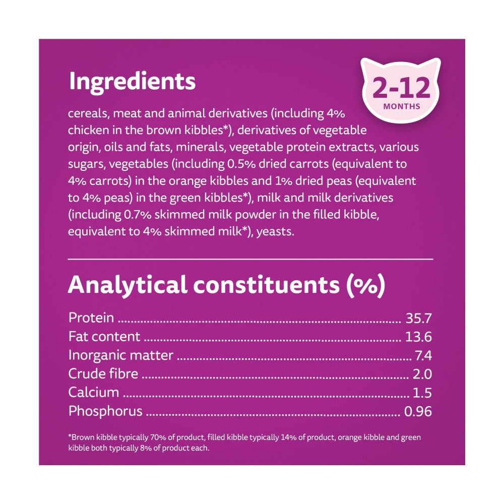 Ingredients: Cereals, Meat and Animal Derivatives (including 4% Chicken in the Brown Kibbles*), Derivatives of Vegetable Origin, Oils and Fats, Minerals, Vegetable Protein Extracts, Various Sugars, Vegetables (including 0.5% Dried Carrots (equivalent to 4% Carrots) in the Orange Kibbles and 1% Dried Peas (equivalent to 4% Peas) in the Green Kibbles*), Milk and Milk Derivatives (including 0.7% Skimmed Milk Powder in the Filled Kibble, equivalent to 4% Skimmed Milk*), Yeasts, *Brown Kibble typically 70% of product, Filled Kibble typically 14% of product, Orange Kibble and Green Kibble both typically 8% of product each.
